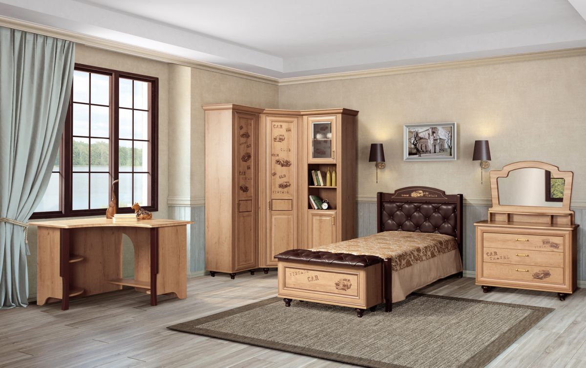 Мебель для детской комнаты «Ралли» – вариант мебели для мальчика, выполненной на базе модулей «Алиса». В основу дизайна модели положена тема гонок и ретро-машин, которыми украшены фасады. Это удачная альтернатива морской темы, так популярной в классической мебели. Кроме того в дизайне угадываются черты стиля Кантри, благодаря использованию древесного декора и патины на фасадах.