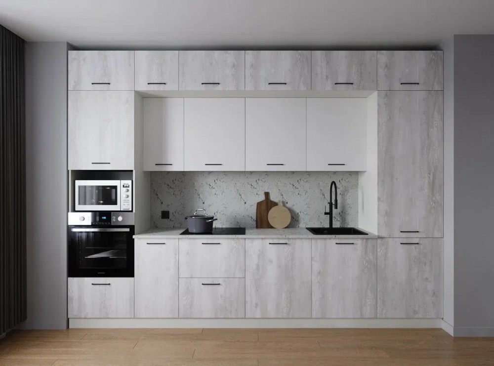 Модули первого верхнего яруса с фасадами со свесом 12 мм, что позволяет открывать их без установленных ручек.