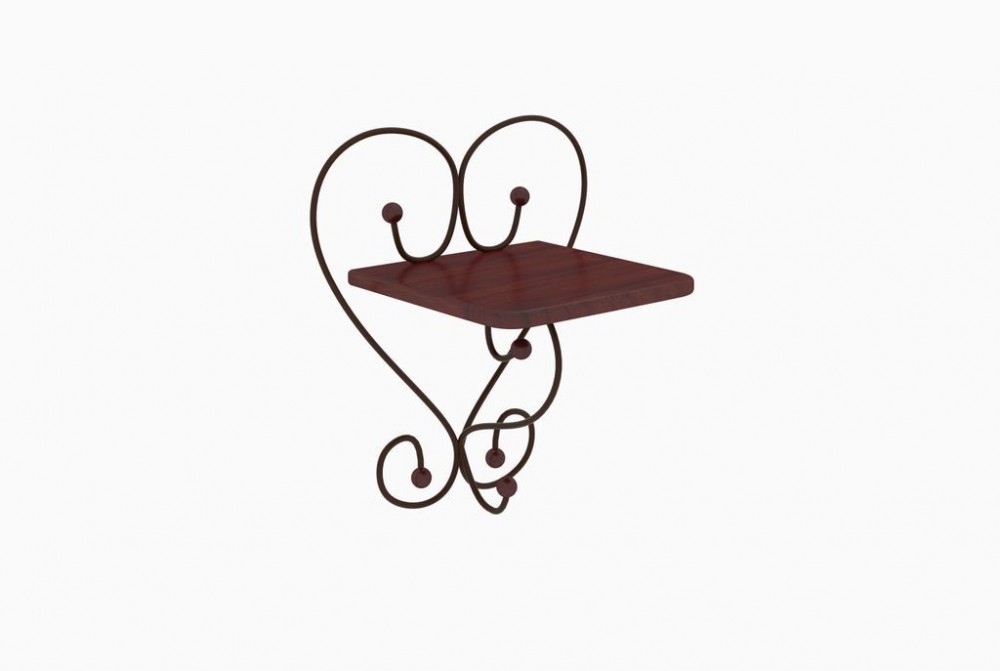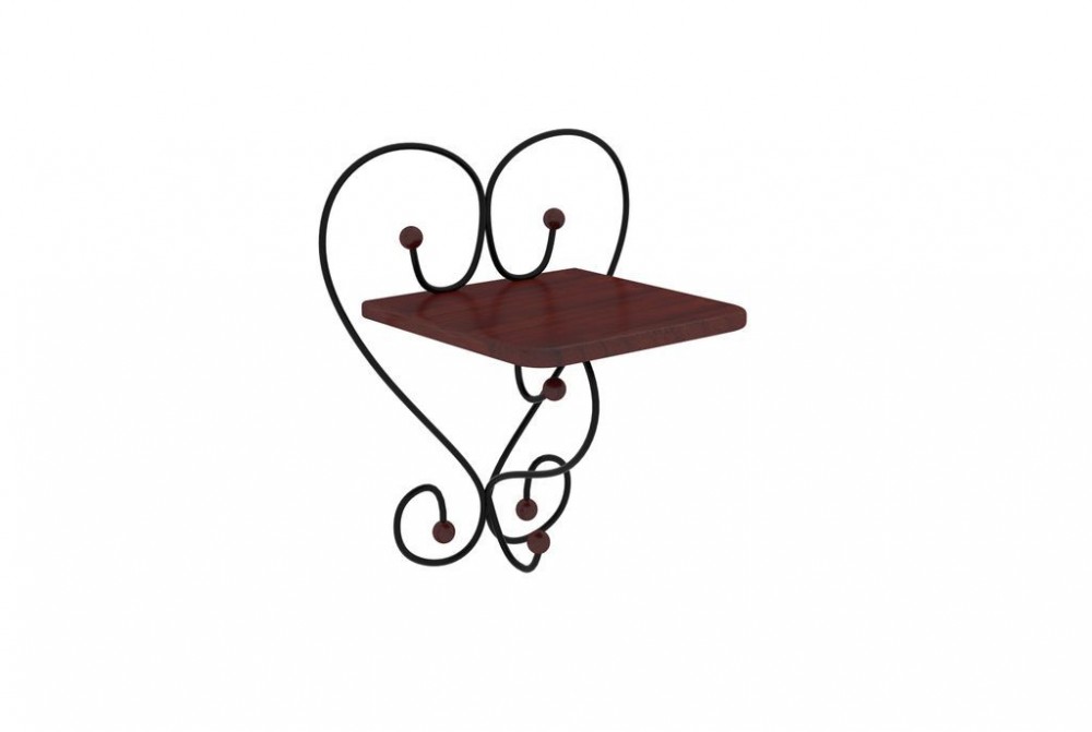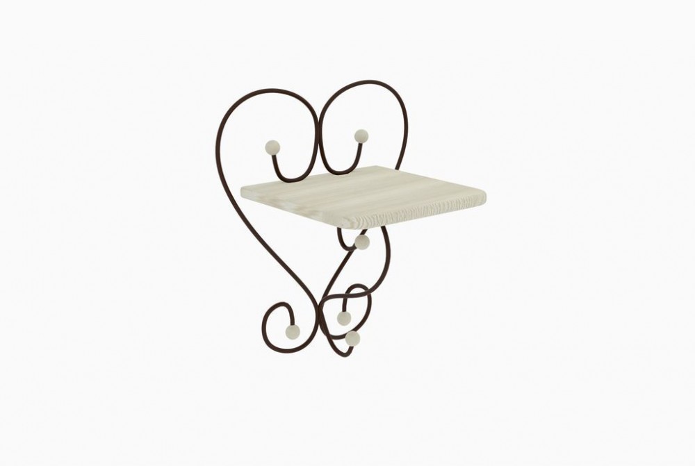 Металлическая настенная полка станет прекрасным дополнением к кровати. Фигурные завитки на кронштейне полки повторяют узор спинок кровати, делая интерьер спальни завершенным.