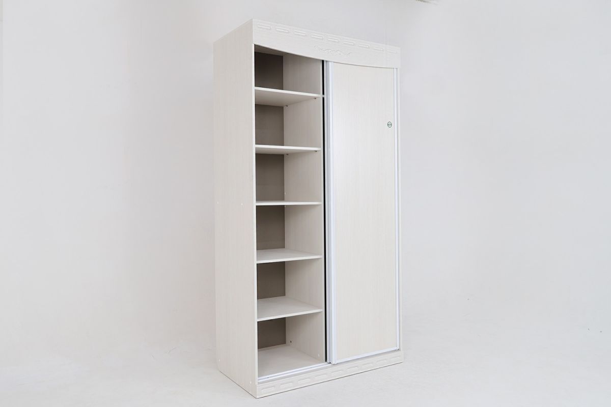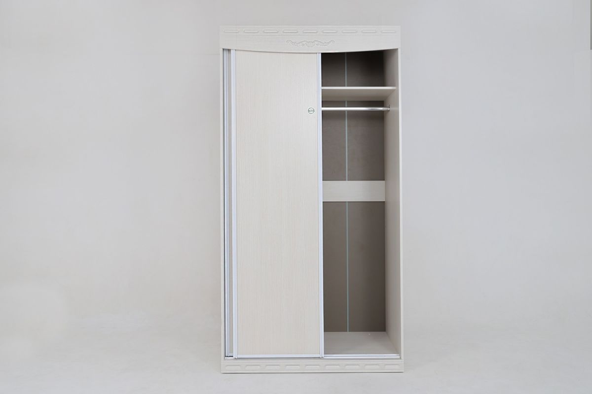 Фасад — МДФ 16 мм с декоративными элементамиКорпус — ЛДСП 16 ммСистема для сдвижных фасадов, металлопрофиль «Найди»Штанга хромированная